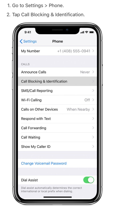 2. Bloquez tous les appels de spam qui arrivent sur votre téléphone dans « Paramètres ». Vous pouvez également bloquer le numéro de votre liste d’appels en cliquant sur le «i» à côté du numéro et en sélectionnant «Bloquer cet appelant». Si vous découvrez plus tard que le numéro est légitime, vous pouvez le débloquer à tout moment en utilisant le même processus.